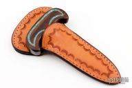 This Push Dagger by Dan Dennehy features a hand rub satin finished double edged blade with .185" blade stock and .981" blade depth, hidden tang construction. Cocobolo handle with crushed turquoise inlays. Includes a hand tooled brown leather sheath. Has a couple light scratches, otherwise excellent condition.