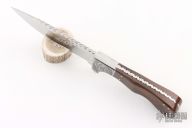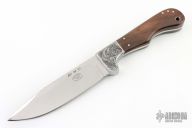 This knife by Glenn Marshall is part of a limited run of 70 knives made to mark 70 years as a knife maker, it has a mirror polished blade with fileworked spine, .194" blade stock and 1.301" blade depth, full tapered tang construction. The handle has engraved and dovetailed stainless steel bolsters, wood scales, lanyard hole at the butt. Comes with a wooden display box. Excellent condition. Glenn was the first inductee into the Texas Knifemakers Hall of Fame.