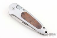 This Speed Lock II Auto from Boker features a satin finish drop point blade with swedge. The handle has an aluminum frame with wood inlay. Lanyard hole in pommel. Includes the original box, sheath, pouch, and papers.  Has a couple light scuffs, otherwise Excellent Condition.