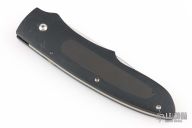 This unusual Corby automatic with a drop point blade with false top edge, mirror polished bevels, and satin flats. The handle has black G-10 scales, rubber insets, stainless steel backspacer, and safety. The trigger button is inset with abalone. Nice lockup, action, and seating. Has a couple light scratches, otherwise excellent condition.