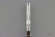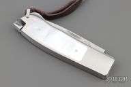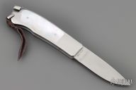 This Tail Lock folder designed by Ron Lake and manufactured in China by Rock Creek Knives. This knife has the quality and workmanship of a custom made knife. It has a hand rub satin finished blade with nail nick. The handle has a mirror polished stainless steel frame with mother of pearl inlays. Has a few light scratches, otherwise excellent condition. Comes with a leather pouch.