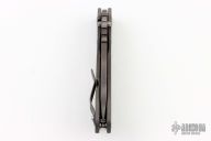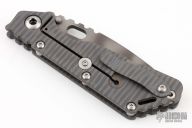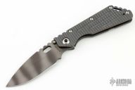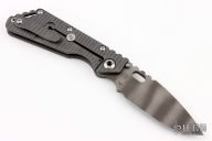 This Mick Strider Performance Series SMF framelock folder features a black finished spear point blade with thumbhole and notched thumbrest. The handle has a flamed titanium frame with titanium clip, tip up carry. Jimping on blade spine. Includes Hinderer "Lock Bar Stabilizer" for maximum reverse lock retention. Nice detent, lockup and blade seating. Excellent condition.