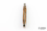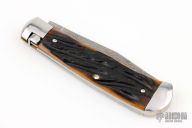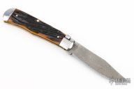 This Express Auto by Schatt and Morgan features a Damascus blade. The handle has stainless steel bolsters, stag jigged bone scales, brass liners, stainless steel spring. Push the lever to fire and close the knife. Has a few light scratches, otherwise excellent condition. Comes with a zippered case.