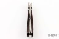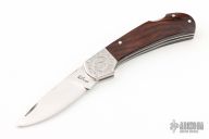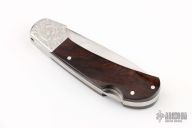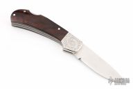 This lockback by Dick Dorough features a high polished drop point blade with a nail nick. The handle has engraved dovetailed stainless steel bolsters, cocobolo scales, stainless steel liners and backspacer. Nice lockup and blade seating. Has some light scratches, excellent condition otherwise.