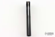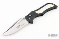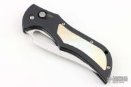 This auto by Gil Hibben features a mirror polished clip point blade. The handle has a black aluminum frame with gold lip pearl inlays and a lanyard hole at the butt. Nice lockup, action and blade seating. This knife is one of only 10 ever made. Comes with a Hibben zipper case. Has some light scuffs and scratches, pearl has a couple light chips, great condition otherwise.