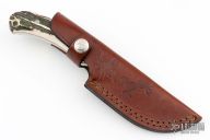 This Custom Hunter By Colt Knives features a .160" 8-A stainless steel blade that has very nice engraving on the grinds and flats. .979" blade depth. Tapered tang construction. The engraving says "Team Colt Calf Roping". This is a limited edition marked 075/600 on the Nickel Silver bolsters. Nicely matched stag scales with lanyard hole. Comes with leather belt sheath. Has scuffs and scratches, great condition otherwise.