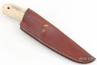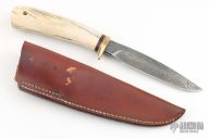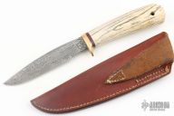 This knife by George Worth features a Damascus blade with .188" blade stock and .948" blade depth, hidden tang construction. The handle has a brass guard, ground stag grip with leather spacers. Comes with a brown leather sheath. Has some scratches, otherwise good condition.