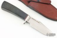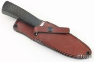 This Classic Blades Trail Guide II from Blackjack Knives features a satin finish clip point blade with false top edge, .212" blade stock and 1.399" blade depth, hidden tang construction. The handle has a stainless steel guard with a black linen micarta grip and red/black spacers. Includes a brown leather sheath. Has some scratches, otherwise excellent condition. 24 prototypes were made.