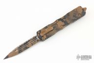 This Dirac Delta OTF automatic by Microtech features a D/E Coyote Camo finished blade with a fully serrated edge. The handle is coyote camo aluminum with a stainless steel tip down clip. Serial number 047 and dated 12/2021. Comes with original box and papers. Excellent Condition.