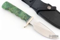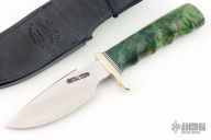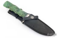 The Model 11 is the original drop-point blade. Designed by Tommy Thompson, noted Alaskan guide, in 1952 for big-game skinning, with point dropped below top of blade to prevent cutting too deeply through skins when used point first. This knife has a satin finished blade with notched thumbrest, .215" blade stock and 1.348" blade depth, hidden tang construction. The handle has a nickel silver guard, dyed and stabilized maple burl grip with finger grooves, and black/duralumin spacers. Comes with a black leather sheath and a zippered case. Excellent condition.