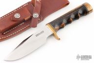 This Sergeant's Special by Randall Made Knife features a satin finished blade with sharpened top edge and a notched thumbrest, .198" blade stock and 1.374" blade depth, hidden tang construction. The handle has a brass guard and butt, black/white ebony wood grip and black/brass spacers. Finger groove style handle. Comes with a brown leather sheath and a zippered case. Excellent condition.