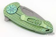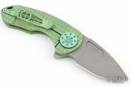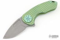 This F3 Compact by Curtiss Knives features a blasted and stonewashed Magnacut blade with notched thumbrest and flipper. The handle has a frag pattern and anodized titanium frame over notched titanium backspacer, matching titanium tip up clip. Smooth and fast opening using a Caged Bearing System. Nice blade seating, detent and lock up.  Includes the original zippered case and COA dated 6-21-23. Has a couple light scuffs, excellent condition.
