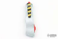 This Combat Troodon OTF automatic by Microtech knives features a Slime white double edged blade, and a Slime white aluminum handle with blue and red hardware, tip down clip. Glass breaker. Comes with original box and papers. New condition.