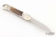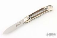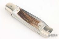 This leverlock auto by Hubertus features a mirror polished drop point blade, nickel silver double bolsters, stag scales, and nickel silver liners and brass pins. Opens with a nice snap. Very fast opening. Comes with original box. Excellent condition.
