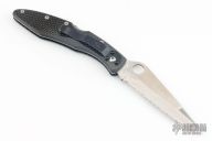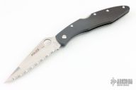 This Police by Spyderco knives features a satin finished clip point blade with full serrations.  The handle has Carbon Fiber scales over steel liners and backspring.  Has a black tip down pocket clip.  Includes the original box.  Has some light scratches on the pocket clip otherwise the knife is in excellent condition.