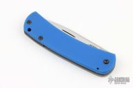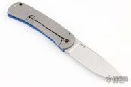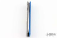 This Sod Buster Framelock by Jonathan McNees features a drop point satin finished blade with nail nick. The handle has a blue g10 scale, acid/tumble finish frame, and textured black g10 backspacer. Nice detent, lock up and blade seating. Comes with Mcnees pouch and makers card dated 2015. Has some light scuffs and scratches, great condition otherwise.