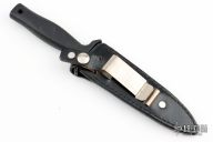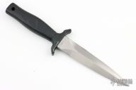 This Mark 1 dagger by Gerber is double-edged and hand rub satin finished, .251" blade stock and .924" blade depth, hidden tang construction. Black coated aluminum handle. Comes with black leather sheath with boot clip. #104996. Has some scratches, has been sharpened, otherwise good condition.