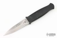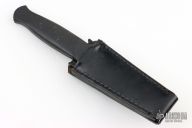 This Gerber Guardian is an R.W. Loveless design and features a satin finish double edged blade with .160" blade stock and .790" blade depth, hidden tang construction. Black aluminum textured handle with "Guardian" stamped on side. Knife includes a black leather sheath. #A2151S on the blade. Has a some scuffs and scratches, has a little wear on the handle finish, the very tip is missing, has been resharpened, otherwise good condition.