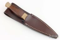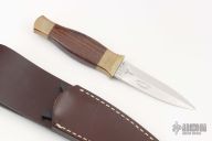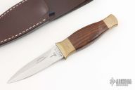 The Guardian began its manufacture in 1981 and was designed by R.W. Loveless. This knife was originally designed for Enforcement and Military Operations. It has a mirror finished double edged blade, hardwood grip with brass bolster and butt. The particular piece comes with the original leather sheath, box and papers. Wonderful condition for its age; never used. Excellent condition. Number 001446