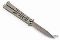 This Tachyon balisong by Microtech has a black tumbled blade and skeletonized bead blast titanium handles. #0417 and dated 12/2001. Has scuffs, otherwise good condition.