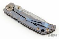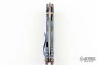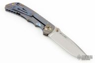 This Harsey framelock folder by Spartan Blades features a stonewash finished drop point blade with dual thumbstuds and a notched thumbrest. The handle has an anodize finish titanium frame with a laser engraving, tip up titanium clip and filler tab. Has nice detent, lockup, and blade seating. Excellent condition. Comes with original box.