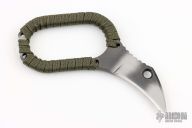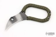 This Tiger Claw by Hideaway Knives features a tiger stripe hawkbill blade with notched thumbrest and cord wrapped grip, .130" blade stock and .626" blade depth, full tang construction. Comes with a kydex neck sheath. Excellent condition. 1.75" x .875" internal dimension of the handle.