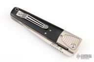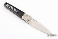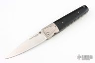 This Caledonian Edge from Cold Steel has a satin finished San Mai III stainless steel spear point blade with single thumb stud and notched thumb rest. Handle is black micarta over titanium liners, titanium bolsters, and lanyard hole. Has a few light scratches, otherwise excellent condition.