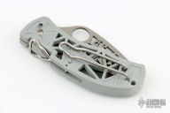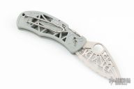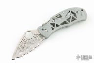 This Q Knife front-lock folder by Spyderco has a skeletonized satin finished stainless steel fully serrated blade with unique, clip-style front lock. Handle is skeletonized polymer with 4-way reversible clip and lanyard hole. Excellent condition. Comes with original box and papers.