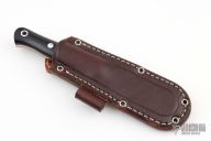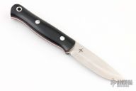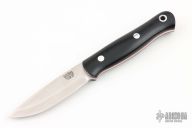 This fixed blade from Bark River Knives features a satin finish drop point blade with a scandi grind, .097" blade stock and .817" blade depth. The handle has black canvas micarta scales, with red liners and stainless pins, over full tang construction. Lanyard hole on pommel. Includes leather sheath and original box. Excellent condition.