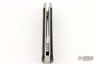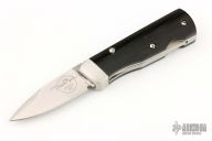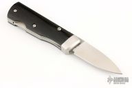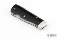 This is an unusual folder from Benchmark with a black linen micarta handle. Opening mechanism pushes blade up and out the front, then locks. Stainless steel liners and stainless steel bolster. Has a couple light scratches, excellent condition otherwise. Comes with a zippered case