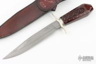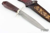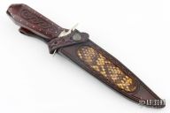 This Bowie by Chuck Schuette features a clip point blade with false top edge carbon steel cable Damascus, .222" blade stock and 1.219" blade depth, hidden tang construction. The blade has a visible temper line. The handle has a polished nickel silver guard and textured butt, carved Snakewood grip with 40 silver pins and fluted nickel silver spacers. Comes with a leather belt sheath with snakeskin inlay, zipper case, and Blade Gallery printout. Excellent condition.