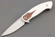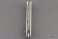 This Rodayo by Ohlone Knives features a satin finished blade with notched flipper. The handle has white G-10 scales with brown canvas micarta inlaid bolsters, white G-10 backspacer, anodized titanium liners, clip and hardware. Rides on bearings, nice detent, lockup and blade seating. Comes with original box. Has a couple light scuffs, otherwise excellent condition. Very nicely constructed.
