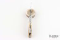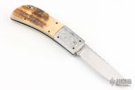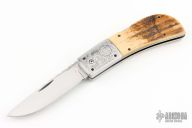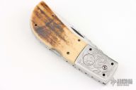 This hidden button release auto from A.A. Sanders features a mirror polished drop point blade with file worked spine and matte finished flats. The handle is comprised of dovetailed and engraved stainless steel bolsters and mammoth ivory scales, over stainless steel liners and fileworked backspacer. Has some scratches, otherwise good condition.