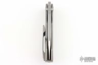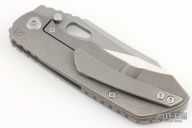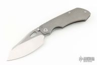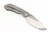 This Evolution 3.0 by Custom Knife Factory features a satin finished blade with notched thumbrest and thumbhole. The handle has a stonewashed bark finished titanium frame with a backspace with a matching tip up pocket clip. Comes with velcro case, extra hardware, and COA. Nice detent, lockup and blade seating.  #425.  Excellent condition.