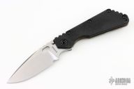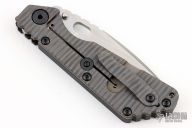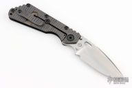 This SMF framelock folder by Mick Strider features a stonewashed drop point blade with a notched thumbrest. The handle features a textured G-10 scale and a flamed titanium lockside with a matching tip up pocket clip. New condition.
