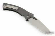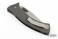 This Amphibian M/A by Microtech #1089 and dated 01/2002 has a bead blasted blade with notched thumb rest and dual thumb studs. Handle has a black anodized aluminum frame with non-slip inserts, lanyard pin, tip up bead blasted stainless steel clip. Comes with original box, sheath and papers.  Has some scuffs and scratches, otherwise excellent condition.