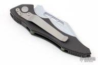 This Vector side opening automatic from Microtech features a silver coated tanto blade. The handle is black aluminum with rubber inserts, green posts and a tip down blasted stainless steel clip. Dated 12/99 and #0644. Comes with original box, papers, and sheath. Has a couple light scuffs, excellent condition otherwise.