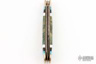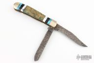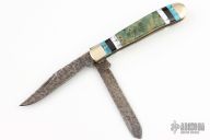 This Buck knife Customized by David Yellowhorse is a slipjoint with nickel silver bolsters, dyed maple burl covers with stone inlays on either side, brass liners and stainless steel springs. The blades have a knapped finish with fileworked spines. Comes with original box and papers. Has a few light scratches, otherwise excellent condition.
