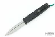 This is a push button single action automatic by SWAT double-edged spear point blade with bead blast finish. T6 black aluminum handle with hatched pattern milling, tip down stainless steel clip. Blade is retracted by pressing button and pulling recharge handle in the butt. Slide safety. Has a few light scuffs and some wear on the safety, otherwise excellent condition.