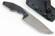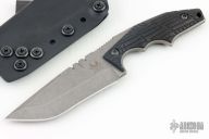 This POGN-XL by Bawidamann Blades features a stonewashed recurve blade with a false top edge, notched thumbrest and fileworked spine, .163" blade stock and 1.557" blade depth, full tang construction. The handle has contoured black G-10 scales. Comes with a kydex sheath with belt clip. Excellent condition.