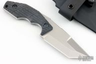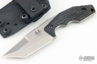 This POGN fixed blade from Bawidamann Blades has a stonewash finished blade with notched thumbrest and sharpened top edge, .165" blade stock and 1.451" blade depth, full tang construction. The handle features black G-10 scales. Comes with kydex sheath. Excellent condition.