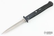 This Phantom Italian swing guard automatic by Dynamic Knife Designs has a satin finish blade and black aluminum handle. Features a ramped side positioned stainless steel safety just below the firing button. False top edge. Button release/single action with closure via the rear positioned lockbar release. Dual leaf and coil spring action providing an extremely fast opening. When closed, the dual guard rests on the frame, encompassing the blade tang. Upon opening, the guard swings into a locked position. Includes the original box. Excellent condition.