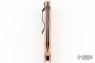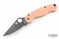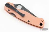 This Paramilitary 2 Linerlock Folder has a black clip point REX45 blade with thumb hole and notched thumb rest. Handle is tumbled copper with stainless steel liners and stainless steel 4-way reversible clip. New condition. Comes with original box and papers. Blade HQ Exclusive.