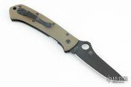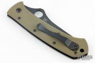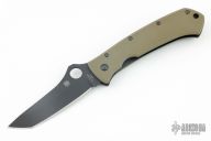 This Bob Lum designed folding knife by Spyderco features a black tanto style blade marked with the Lum Logo. Stainless steel liners. Textured green G-10 scales, tip up stainless steel clip. Comes with original box and papers. Nice detent, lockup and blade seating. New condition.