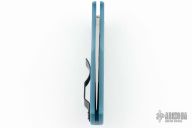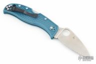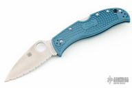 This Leaf Jumper by Spyderco features a fully serrated satin finished blade with thumbhole. The handle has blue FRN scales and a stainless steel clip. Comes with original box and papers. New condition.