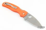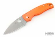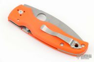 This Shaman PLN by Spyderco features a stonewashed spear point blade with notched thumb and finger rests, thumbhole. The handle has orange G-10 scales, inlaid stainless steel liners and a black stainless steel backspacer, 4-way reversible stainless steel clip, lanyard hole at the butt. Comes with original box and papers. New condition.