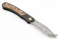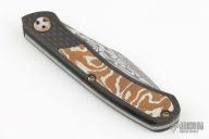 This Slipjoint Michael Burch features a Damasteel clip point blade. The handle has a carbon fiber frame with mokume inlays over a Damasteel spring. Has half-stop, flush in all positions. Includes a stingray zipper case. Excellent Condition.