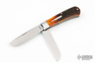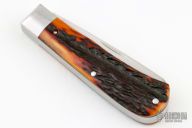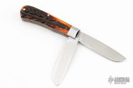 This 2-Blade Bullet Knife Remington reproduction by Bill Ruple has two hand rub satin finished blades with nail nicks. The handle has pinched satin finished 416 stainless bolsters, amber stag covers, brass stainless and steel springs. Has half-stops, flush in all three positions. Comes with zipper case and Maker's card.  Has some light scratches, excellent condition otherwise.