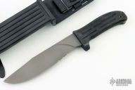 This MPK from Mission Knives features a clip point titanium partially serrated blade with bead blast finish made from titanium, .247" blade stock and 1.526" blade depth, hidden tang construction. The handle is comprised of an black Kevlar strengthened kytrel. Lanyard hole on the pommel. Includes original sheath and a custom kydex sheath. Has some sheath scratches, otherwise excellent condition.