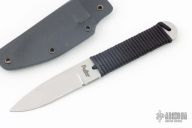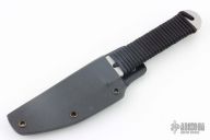 This boot knife by Al Polkowski has a bead blasted blade with notched thumb and finger rests, and a black paracord wrapped handle, .133" blade thickness and .956" blade depth. Full tang construction. Great look and feel. Comes with 3 kydex sheaths. Has some light sheath scuffs, otherwise excellent condition.
